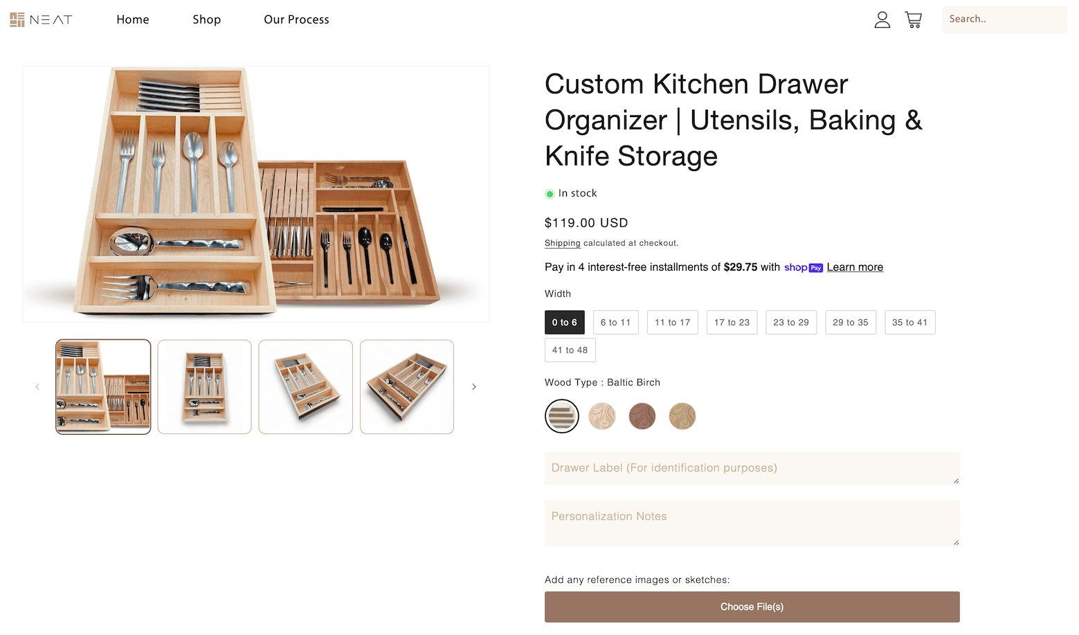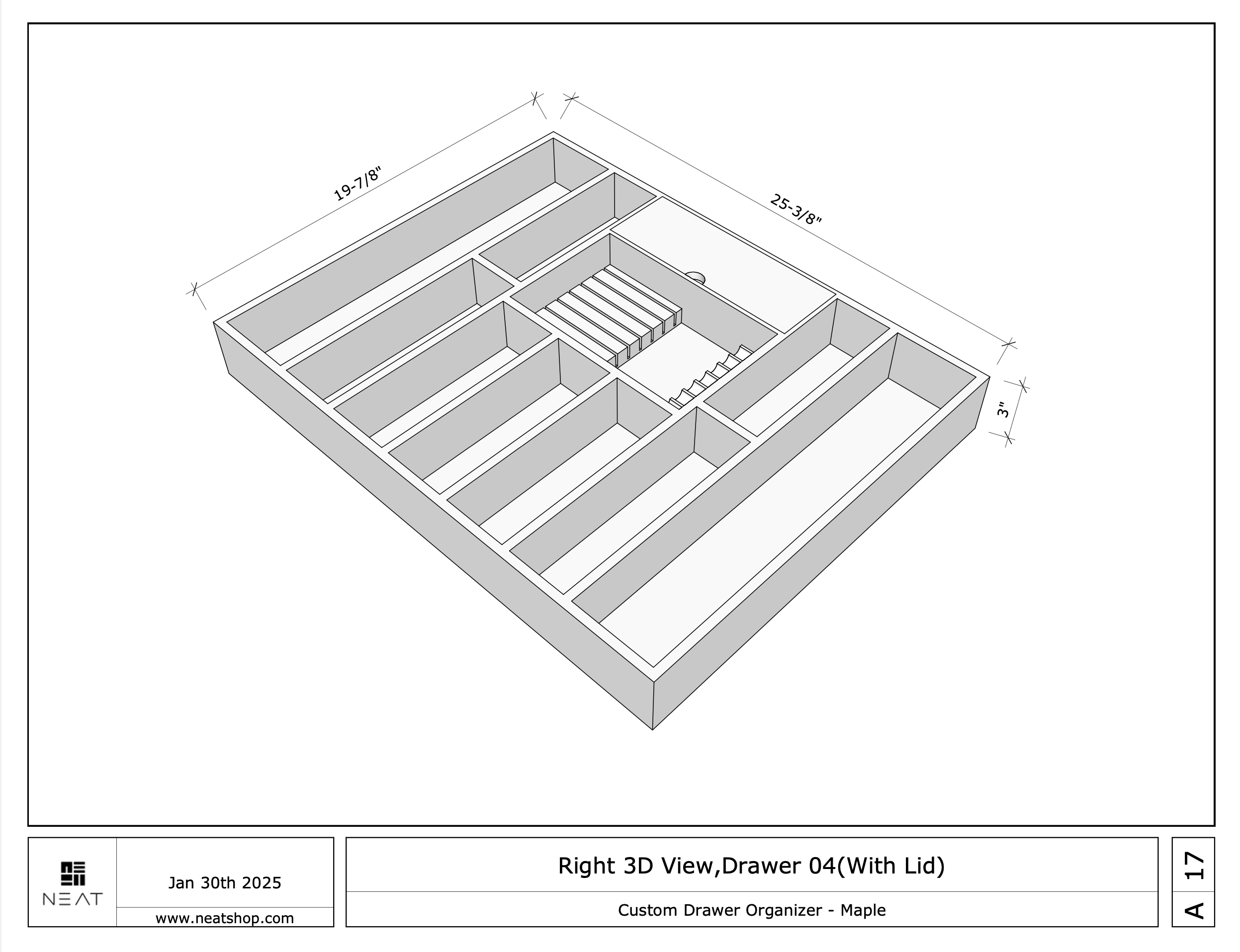 Once your order is placed, our team will review your customization details. We will reach out to your with your initial set of plans for your review. During the design process we are happy to make revisions until your exact organization needs are met. Only once you approve of the design will we start to build your organizer. We will keep you updated throughout the building process, and you will receive a notification when your organizer is ready to ship. Your custom drawer organizer will be delivered to your doorstep, ready to transform your space.