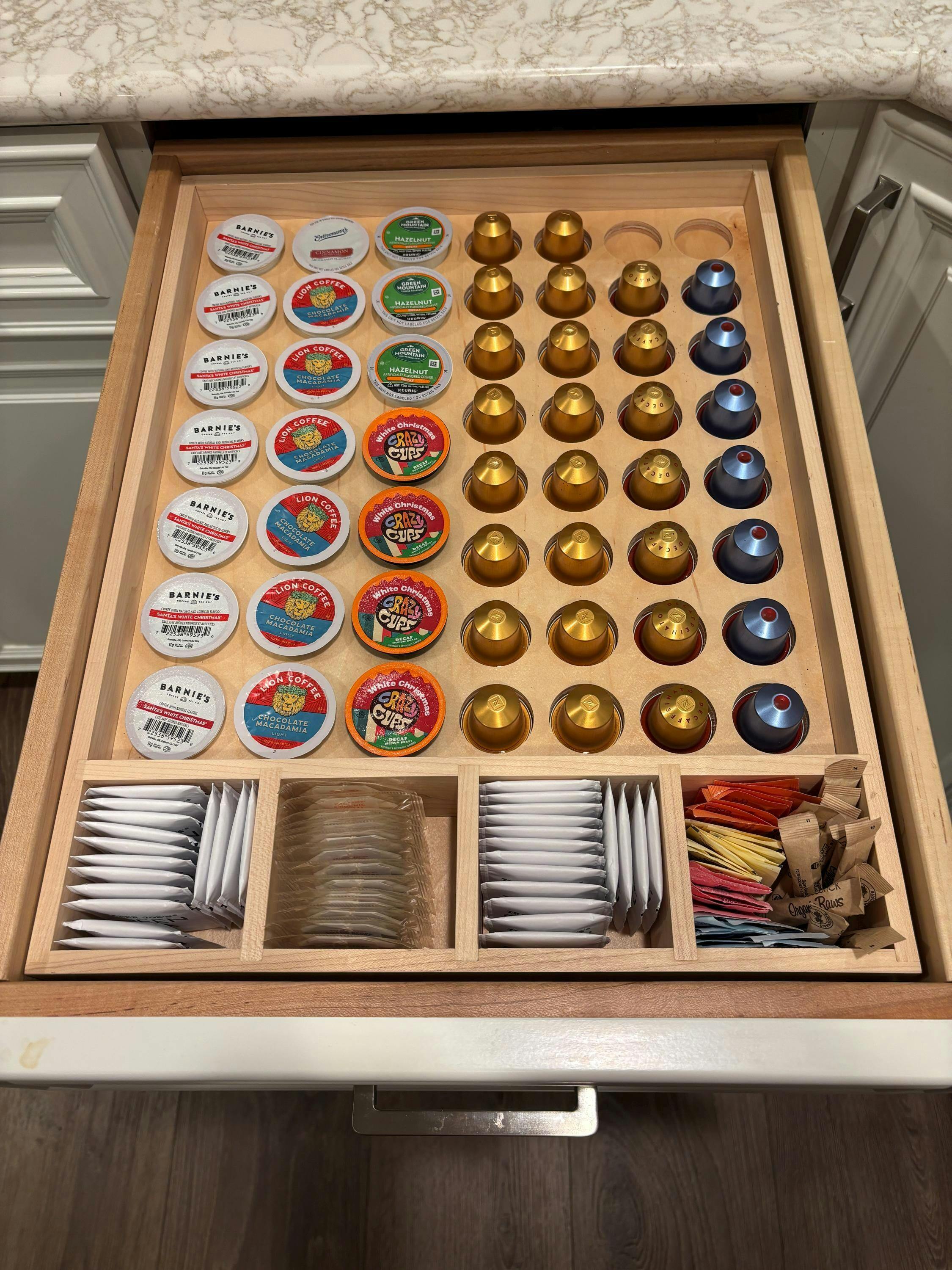 Great quality, craftsmanship and customer service. Quick response and accurate custom drawing based on individual specs. Did a mix of K-cups and Nespresso capsules and turned out perfect...Loved the product!!!
